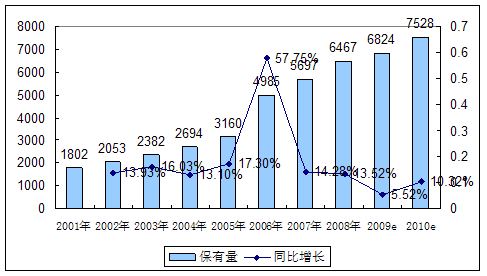 皮带张紧轮需在应用一定时间后进行更换,其需求与我国汽车保有量密切相关,比如捷达车出厂规定:(五阀)每60000公里更换。(两阀)每80000公里更换。从我国民用汽车保有量来看,呈不断上升趋势,但由于2008年的经济危机,预计09年新购汽车可能减少,保有量增速回落。预计随着经济的逐步复苏,汽车市场将再次活跃,汽车保有量较快的增长,未来皮带张紧轮的市场空间巨大。