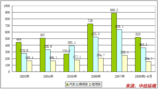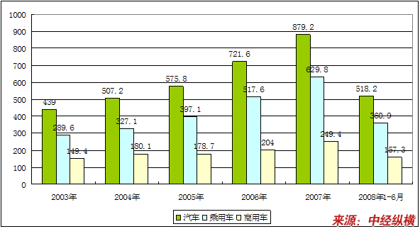 据中国汽车工业协会统计,受原材料价格上涨、油价上涨以及雪灾、震灾等因素影响,2008年上半年国产汽车产销分别为519.96万辆和518.22万辆,同比增长16.71%和18.52%,低于2007年同期22%以上的增长速度。随着钢材等原材料价格的继续走高,国Ⅲ排放法规的全面实施,油价上涨加大用车的使用成本以及其他不确定因素,下半年国内汽车 市场发展 总体形势将会较为严峻,预计下半年汽车产销总量可能会与上半年持平或略低,现初步估计下半年销量为517.5万辆,略低于上半年,全年预计总销量为1035.7万辆。