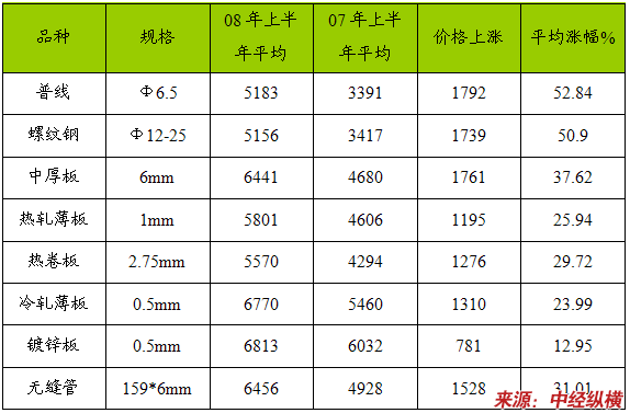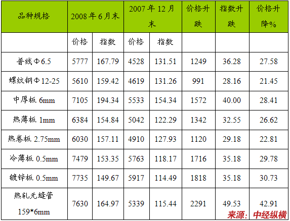 从八个主要钢材品种价格看,上半年价格升幅较大的是热轧无缝管、镀锌板和冷轧薄板,升幅较小的是螺纹钢,其它品种价格稳中有升。