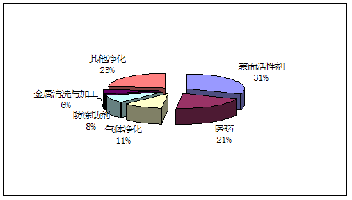 据初步调查,乙醇胺用户主要集中在沿江、沿海地区,特别是华东地区和广东省,其他地区乙醇胺用户较少,消数量较低。我国乙醇胺的消费比例大致为表面活性剂31%,医药 行业 21%,气体净化11%,防冻助剂8%,金属清洗与加工6%,其他23%。
