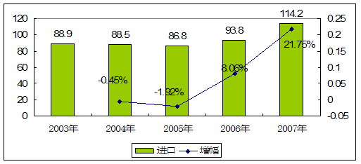 2003-2007年我国乙醇胺产品进口量及增长统计