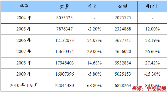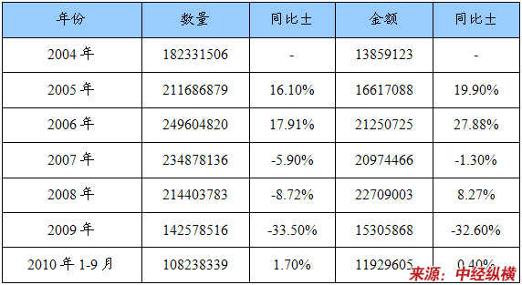 2004-2010年未膨胀的蛭石及珍珠岩出口量值统计