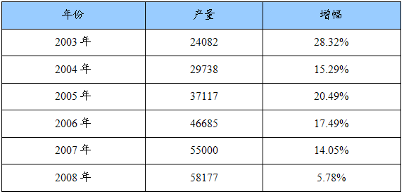 2003-2008我国钢材产量及增幅