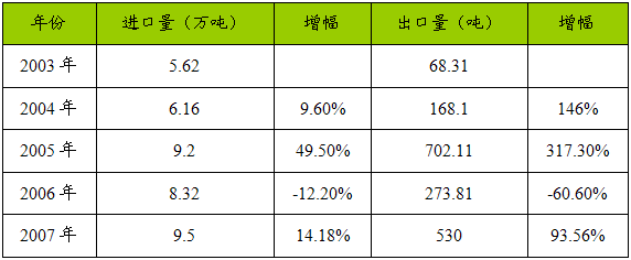 2003-2007年用于生产LLDPE自粘缠绕膜的LLDPE进出口量