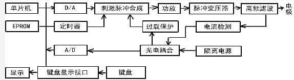 上图是一种电刺激治疗仪的电路原理框图,由单片机、D/A转换器、可编程定时器、刺激脉冲合成、功率放大器、脉冲变压器、刺激电流检测及数码显示、过载保护等部分组成。D/A转换器用来控制刺激脉冲的幅度,即微机向D/A转换器输出一个数字量,由D/A转换为与某数字量成正比的模拟电压,此模拟电压的大小就决定了刺激脉冲的幅度。可编程定时器通过编程产生的脉冲决定刺激脉冲的频率和宽度。刺激脉冲合成电路将上述信号合成为一定幅度的双向脉冲送功率放大器。在刺激器的输出级采用脉冲变压器,一方面起升压作用,另一方面起人体安全隔离作用。在变压器输出端,接有高频滤波器,以防止上电和关电时对病人可能产生的电冲击。