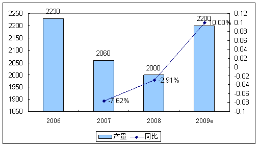 2006—2009年玻纤沥青瓦产量统计及预测图