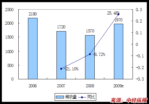 2006—2009年玻纤沥青瓦需求量统计及预测图