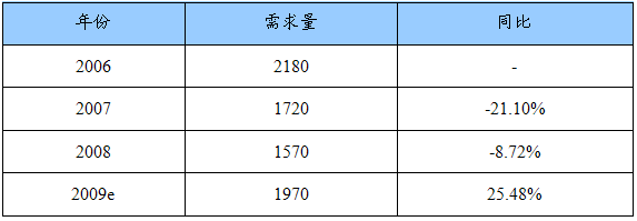 2006—2009年玻纤沥青瓦需求量统计及预测表