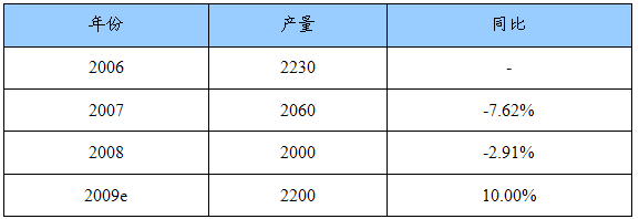 2006—2009年玻纤沥青瓦产量统计及预测表