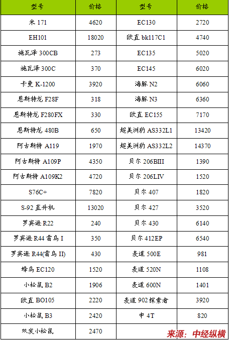 近几年,直升机价格呈直线上涨,以EC135为例,EC135是一种用途广泛的直升机,无论是民用,还是警用和军用都有广泛的客户群。该直升机从2000年的约300万美元价格攀升到了当前的近600万美元,价格几乎翻了一番。未来,直升机价格一路看涨,一些高技术含量的产品,由于技术水平较高,其价格将比老产品有所提高,但产品性能价格比与老产品相比将有明显的优势。