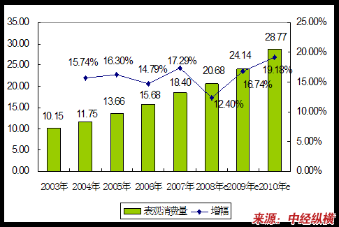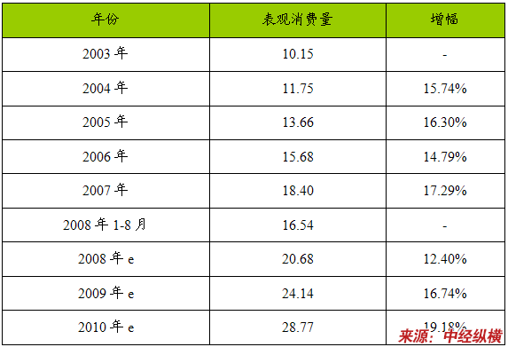 从我国铸铁型材的表观消费量来看,近几年来一直以15%左右的速率增长。2003年我国铸铁型材的表观消费量为10.15万吨,2004年增加到11.75万吨,比上年增长了11.74%,2005年表观消费为13.66万吨,2006、2007年分别为15.68、18.40万吨。预计2008年表观消费量为20.68万吨,增幅下降到12.40%,其主要原因是金融危机的影响使得市场需求、企业产量都受到了很大的影响。预计到2010年我国铸铁型材的表观消费量为28.77万吨。