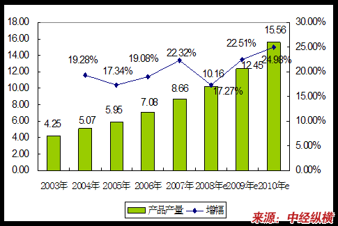 我国铸铁型材的发展速度较快,2003年全国 行业 产量为4.25万吨,到2004年产量增加到5.07万吨,比上年增长了19.28%,2005年产量5.95万吨,2006、2007年产量增幅分别为19.08%、22.32%,到2007年底,全国铸铁型材产量达到8.66万吨。预计在未来 行业 需求增加,企业规模及产能扩大的情况下,我国铸铁型材的产量依然保持较快的增速,但由于2008年全球金融危机的影响,2008年产量增速将放缓,全年产量预计为10.16万吨,而2009年下半年 行业 将逐渐恢复生产增长,预计到2010年全年产量将达到15.56万吨。