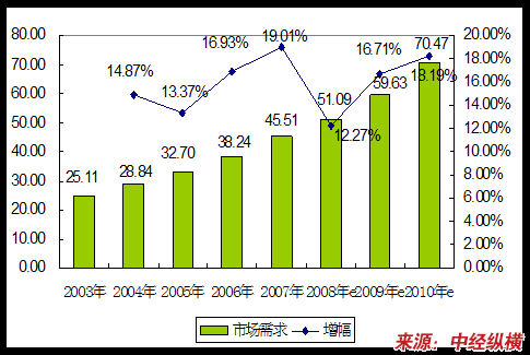 近几年我国铸铁型材的市场需求量及增长率发展较快,2003年我国铸铁型材的市场需求为25.11万吨,2004年市场需求量为28.84万吨,比上年增长了14.87%,2006年我国铸铁型材的市场需求增长速度为16.93%,2007年市场需求增加到45.51万吨。受金融危机的影响,2008年下半年市场需求增速出现下滑,全年市场需求增速下降到12.27%,而预计2009年、2010年随着我国下游市场对铸铁型材需求的进一步增加,市场需求将逐渐恢复,到2010年市场需求达到70.47万吨。