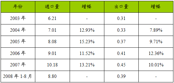 2003年我国铸铁型材的进口量为6.21万吨,出口量为0.31万吨,2004年进口量为7.01万吨,出口量为0.33万吨,同比分别增长了12.93%、7.89%。2006年进口量增幅为11.52%、出口量增幅为12.36%,到2007年进出口量分别为10.18、0.45万吨,比上年分别上涨13.21%、10.01%。
