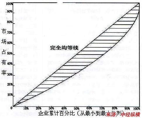 根据调研所得数据可以绘制出一条描述我国桩工机械 行业 竞争状态的洛伦兹曲线。图中可以看出洛伦兹曲线很平滑,并偏向于完全均等线。市场中的大中型企业占地坪企业数量的80%,市场份额占到60%以上,而小型企业仅占桩工机械企业数量的20%,市场份额不足40%,这说明我国桩工机械 行业 的市场基本处于一种垄断竞争的状态,大中型企业因自己的规模在 行业 中形成垄断的规模经济。