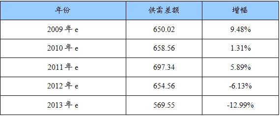2009-2013年我国乙二醇供需差额及增幅预测表