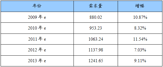 2009-2013年我国乙二醇需求量及增幅预测表