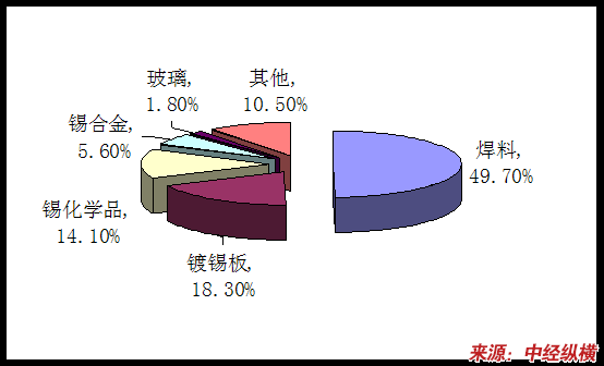 从传统消费结构来看,锡主要应用在焊锡、镀锡板、锡基合金及锡化工领域,应用面比较狭窄。其中焊料约占锡消费量的一半。
