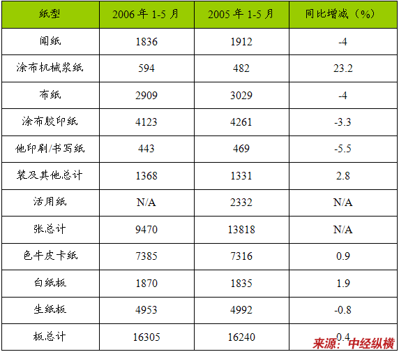 美国造纸 行业 2006年1-5月纸张/纸板产量