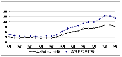 生产资料价格涨幅高位回落。9月份,流通环节生产资料价格比上月下降2.4%,已连续2个月环比下降;同比上涨17.5%,涨幅比上月回落5个百分点。工业品出厂价格同比上涨9.1%,比上月回落1个百分点;原材料、燃料、动力价格上涨14%。