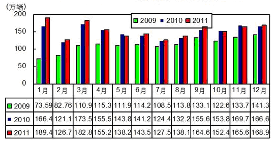 2011年12月,汽车生产169.20万辆,环比下降0.18%,同比下降9.26%;销售168.96万辆,环比增长2.03%,同比增长1.38%。其中:乘用车生产136.42万辆,环比下降0.72%,同比下降5.61%;销售136.89万辆,环比增长1.88%,同比增长4.61%。商用车生产32.78万辆,环比增长2.16%,同比下降21.85%;销售32.07万辆,环比增长2.70%,同比下降10.40%。