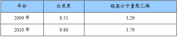 2009-2010年中国PE隔板白炭黑及超高分子量聚乙烯消费量表