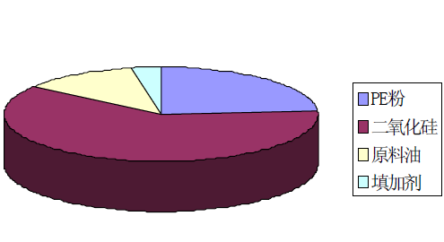 由图中可以看出 在PE 隔板中二氧化硅的比例最大约占62%左右其次为PE 粉约占24% 其余为原料油和添加剂。
