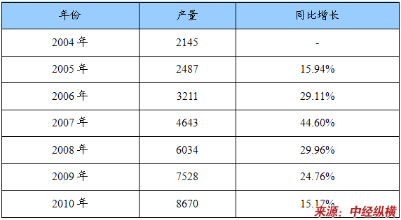 2004-2010年蓄电池PE隔板产业产品产量统计表