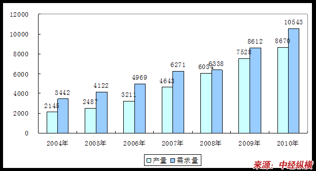 2004-2010年中国蓄电池PE隔板产量、需求量对比