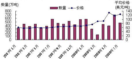 2008年7月当月我国进口煤338.8万吨,同比下降13%,环比增长21.7%;进口平均价格为89.5美元/吨,上涨1.1倍。
