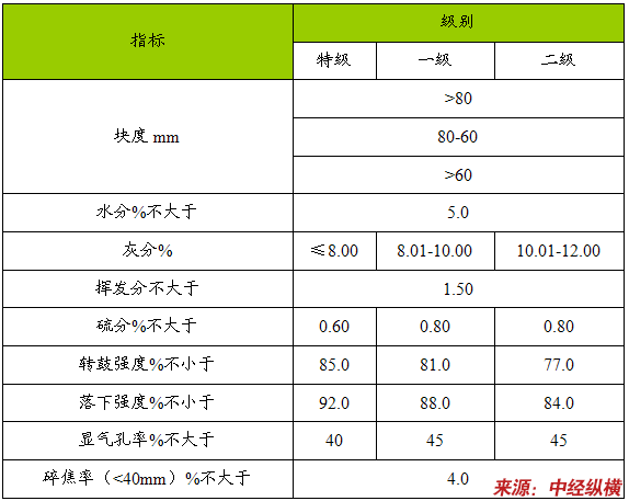 注:1)表内三级铸造焦炭按块度分为三类:大于80mm、80-60mm、大于60mm(统焦,强度指标以大于80mm为准)。