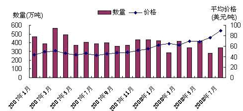 2007年1月—2008年7月我国煤炭进口量价图