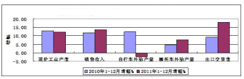 力车胎30家重点企业数据统计,2011年工业总产值同比增长12.17%,销售收入同比增长13.61%;主导产品中自行车外胎产量同比下降2.4%,摩托车外胎产量同比增长7.57%。出口交货值与去年同比增长18.04%;出口率(值)20.15%,同比增长1.0个百分点。