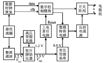 数字控制模块是植入刺激电路中的数字部分,这部分采用有限状态机设计,在不同的状态下生成相应的控制信号。它以数据时钟模块恢复出的时钟为工作时钟,将数据时钟模块恢复出的数据进行译码,提取出刺激强度控制数模转换电路,提取出刺激维持时间、刺激电极序号控制开关阵列。设计中使用的指令帧格式,指令首位是帧起始位,然后依次是刺激模式、刺激强度、刺激脉宽、电极编号1、电极编号2、最后一位是奇偶校验位。该部分电路采用标准ASIC设计流程,规模约1500门,功耗730μW@10MHz。