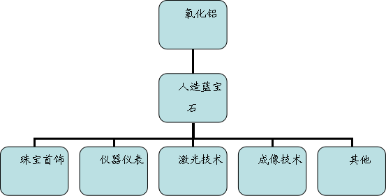 中国人造蓝宝石 行业 包括上游原料生产和下游 行业 制造两大分支。上游原料为氧化铝生产,下游产品主要包括珠宝首饰制作、仪器仪表、激光技术、光纤通讯、光路传输、成像技术诸多领域,相关企业达上万家。