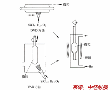 VAD法是有日本 研究 开发的一种制作光纤预制棒的方法。主要工艺是:1)通过燃烧管将原料气化的SiCl4和O2以及H2导入反应室中。2)SiCl4和水反应生成SiO2。3)生成的SiO2微粒在垂直引上同时旋转的石英玻璃管的头部堆积而成实心的SiO2微粒多孔质棒。4)经过Cl2的除水以及在氦气氛中进行1500℃左右的高温烧结而制成透明的熔融石英。