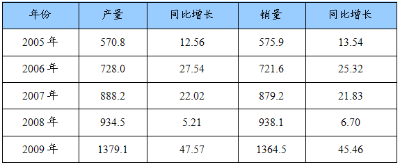 进入2009年,我国汽车产销情况开始好转,2009年国产汽车产销突破1300万辆,同比增长创历年最高,乘用车产销首次超过1000万辆,商用车总体呈良好表现。2009年汽车工业的迅猛发展,使我国成为世界第一汽车生产和消费国。