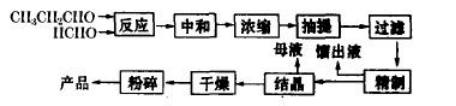 三羟甲基乙烷的生产采用丙醛与甲醛在催化剂作用下,进行羟醛缩合反应,生成中间体β—羟基醛),接着进行坎尼扎罗反应(Cannizzaro),生成目的产物三羟甲基乙烷,粗品经过中和过滤、抽提、精制、结晶、干燥、粉碎等工艺过程,制得成品。其工艺流程框图如下: