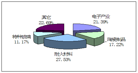 目前熔融石英的消费主要集中在耐火材料、陶瓷制品及电子产业生产领域。其中耐火材料及电子产业消费量均占到产品总消费量的20%以上。在陶瓷制品领域的消费近些年增长很快,主要是伴随着一些高新科技产业的发展,熔融石英陶瓷应用领域涉及到宇宙飞船、火箭、导弹、雷达、原子能、电子、钢铁、炼焦、有色金属、玻璃等工业领域,作为一种新型的高科技应用材料,其消费增长潜力巨大。