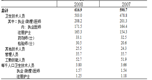 2008年末,医疗机构卫生人员581.8万人,其中:卫生技术人员478.0万人,内:执业(助理)医师198.6万人、注册护士163.3万人。疾病预防控制中心卫生人员19.7万人,其中:卫生技术人员14.9万人。