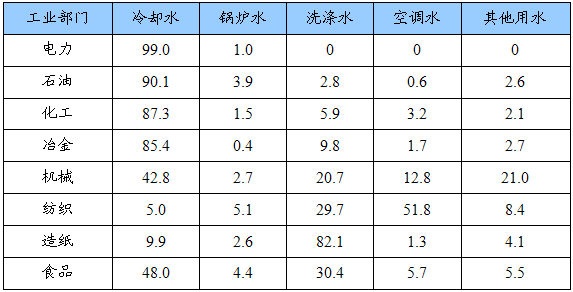 不同工业部门中,电力、冶金、石油、化工 行业 主要为冷却水,机械 行业 主要为冷却用水和洗涤用水,纺织 行业 主要为空调用水和洗涤用水,造纸 行业 主要为洗涤用水,煤炭 行业 主要是洗涤用水。各种工艺所占比重。