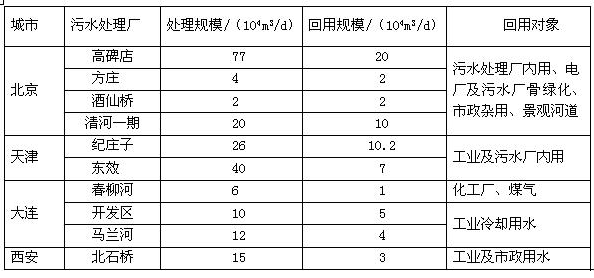 处理后污水回用生活杂用水,北京最具代表性。到目前为止,北京已经建成投入使用了160多个中水设施,这些设施大多集中在宾馆、饭店和大专院校,它们以洗浴、盥洗等日常杂用水为水源,经过处理在到中水水质标准后,可以回用于冲厕、洗车、绿化等。目前这些中水设施处理能力已经达到4万,回用水量约。中水建设已初具规模。为实现北京2008年“绿色奥运”的承诺,使城市污水回用率达到50%,北京市将新建9座中水厂,以加大污水再生回用,推广城市中水的使用。