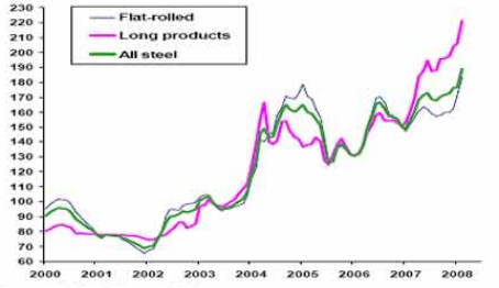 2009年,钢铁需求将大幅放缓,未来钢价将持续弱势运行。从固定资产投资的相关性来看,预计2009年粗钢消费增速仅为5.7%,远远低于2007年的13.8%。从下游 行业 来看,房地产、汽车、家电和造船等均面临下行压力,基建和农村市场尚且乐观。钢铁 行业 将处于需求下滑引发的钢价下跌,继而导致原料价格跳水,从而使得钢价进一步下跌的弱势循环,通过波及全 行业 的减产虽能形成暂时的供需平衡,但宏观经济的弱势运行将使得钢价面临持续调整的压力。预计2009年钢材价格全年均价同比回落17%,国际钢价亦陷入调整。
