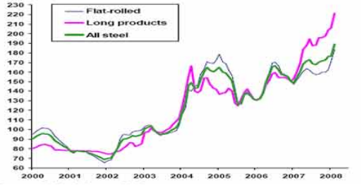 从长期影响来看,原材料价格的持续上涨将会使企业面临生产经营的困境,就2006年底到2008年上半年的情形来看,钢材价格大幅上涨,持续时间较长,对于大多数生产企业来说,原材料价格的上涨直接导致了产品生产成本的上升,企业经营利润的下降。虽然企业在不同产品上进行了价格调整,但价格调整的结果却导致了用户市场对产品需求的下降。由此可见,仅钢材涨价就给企业带来了很大的成本压力。而原材料价格走低,对生产企业来说,在预定的原材料资金里有了部分结余,可以使企业加大生产经营,增加企业利润率。