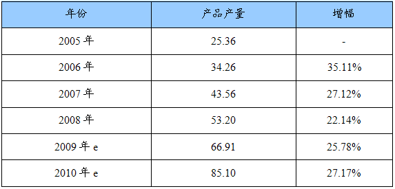 2005—2010年轻型纸规模以上企业产品产量 分析 及预测表