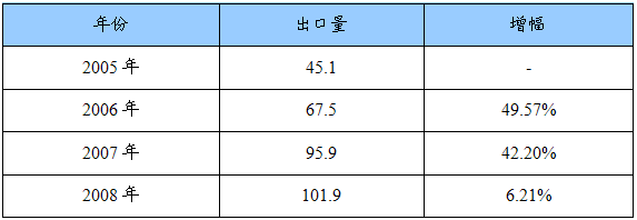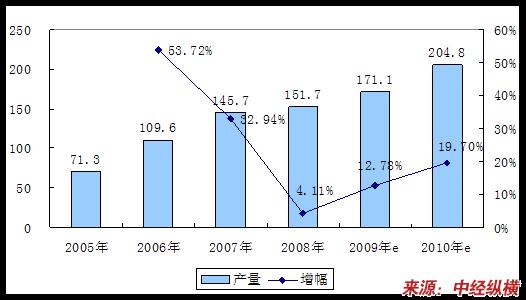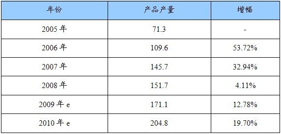 2005年以来,我国人造蓝宝石 行业 产品产量有了较大幅度增长,2005~2008年年平均产量增长速度达37.58%。随着梧州人造宝石在国际市场地位的加强, 行业 企业投资加大,带动了人造宝石产量的快速增长。