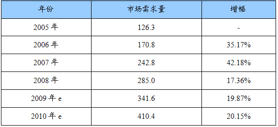 2005—2010年人造蓝宝石产品市场需求及预测表