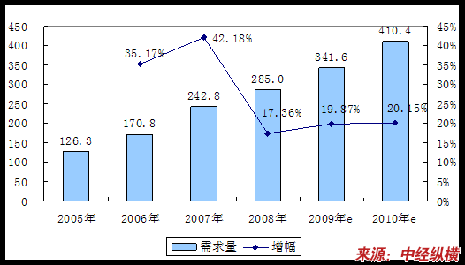 2005—2010年人造蓝宝石产品市场需求及预测图