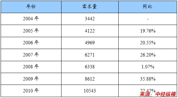 2004-2010年蓄电池PE隔板产业产品需求量统计表