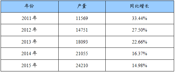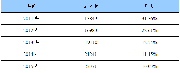 2011-2015年我国蓄电池PE隔板需求量及增幅预测表